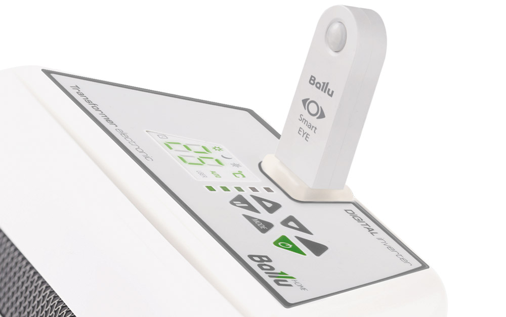 Датчик присутствия Smart Eye, расположенный на приборе, например, электрическом конвекторе Ballu, фиксирует нахождение человека в помещении и позволяет синхронизировать работу прибора с непосредственным присутствием человека в зоне действия конвектора, управляя интенсивностью его работы.
